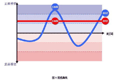諾貝爾獎得主心理學家Daniel Kahneman發(fā)現(xiàn)人們在一次體驗中只會記住兩件事:峰值感受(流程中最好或最差的一點)以及終了感受。我運用“峰值——終了規(guī)則”將每個子流程上的情感感受按照自然時間順序連成一根“情感”曲線,如圖1所示。