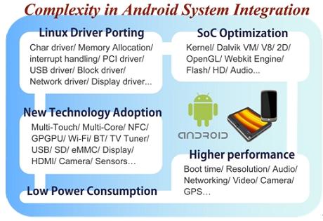 對廠商而言,開發(fā)一款A(yù)ndroid設(shè)備,不僅僅只是將所有零組件組合成為一個產(chǎn)品那么容易,最大的學(xué)問便在于將系統(tǒng)單芯片(System-on-a-chip,SoC)、各種新技術(shù)和Android系統(tǒng)進行整合,SoC涉及像是Dalvik Virtual Machine、OpenGL、V8、Webkit Engine等上層的演算,與Android間的結(jié)合便必須透過不斷的嘗試與驗證,才能研發(fā)出既符合成本效益、又有良好效能的優(yōu)化產(chǎn)品。目前市面上有些SoC廠商已針對Android系統(tǒng)的特性,提供整合過的SoC平臺,將藍牙、相機或上網(wǎng)等常用功能模組預(yù)先寫入,減少終端成品廠商費力整合開發(fā)的時間,但對廠商而言,這樣的預(yù)先整合是否適合自身產(chǎn)品,以及是否需要再作更細致的修改,則又是更困難的課題。