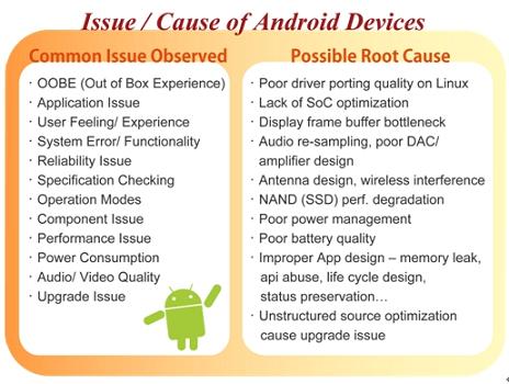 盡管Android系統(tǒng)的普及看似指日可待,但在實際的產(chǎn)品應(yīng)用上,也有其可能產(chǎn)生的問題風(fēng)險。Android作為一個開放式的操作系統(tǒng),是Google提供廠商的操作系統(tǒng)參考架構(gòu)(reference design),廠商能有充足的發(fā)揮空間,以Android為基礎(chǔ)向上開發(fā)設(shè)計自家產(chǎn)品,但也因為這樣的開放性與自由性,讓廠商在軟硬件結(jié)合的這個環(huán)節(jié)必須下更大的功夫,像是如何挑選合適的硬件包括基頻處理器、通信芯片、觸控感應(yīng)芯片、天線與存儲器模組等,以及如何調(diào)整出最適當?shù)能浖O(shè)定等,更重要的是如何將軟硬件整合,開發(fā)出差異化的產(chǎn)品。這中間所有的細節(jié)都會對產(chǎn)品最終樣貌產(chǎn)生莫大的影響,像是其功能的完整度、使用接口的設(shè)計、效能表現(xiàn)(例如觸控滑動畫面、開啟程序所需時間)、品質(zhì)可靠度、甚至是后續(xù)的固件升級動作等等。在此百佳泰便試圖以專業(yè)中立的測試實驗室角度,來點出廠商應(yīng)用Android于手機、平板電腦或其他設(shè)備時應(yīng)注意的開發(fā)重點,以希冀作為一個有效的參考資訊。