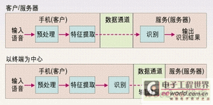 3G手機(jī)的ASR應(yīng)用設(shè)計(jì)可分為兩類,即以終端為中心和以客戶/服務(wù)器為中心的應(yīng)用。如圖1所示為以終端為中心的設(shè)計(jì)方法,3G手機(jī)(終端)執(zhí)行整個(gè)語音識別過程并送出識別結(jié)果。在圖2所示的客戶/服務(wù)器方法中,終端只是執(zhí)行預(yù)處理特征提取,然后通過一個(gè)誤碼受保護(hù)的數(shù)據(jù)信道將這些參數(shù)發(fā)送給中心服務(wù)器,中心服務(wù)器最終完成語音識別。如果采用以客戶/服務(wù)器為中心的設(shè)計(jì)方法,3G手機(jī)應(yīng)使用數(shù)據(jù)信道而非移動(dòng)信道來將語音發(fā)送給服務(wù)器進(jìn)行識別,因?yàn)橐苿?dòng)信道所用的低速率語音編碼會(huì)嚴(yán)重影響語音識別的性能。