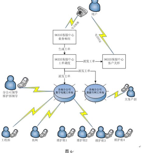 用戶致電96335呼叫中心的工單,由96335的中心處理席根據(jù)工單反應(yīng)的細(xì)節(jié)分派到各個(gè)服務(wù)站,移動(dòng)實(shí)時(shí)工作流根據(jù)預(yù)先設(shè)定的工作流程和條件流轉(zhuǎn)到相關(guān)的處理人,服務(wù)人員在移動(dòng)智能手機(jī)終端的客戶端軟件可以查詢他所要辦理的工單,已經(jīng)完成辦理的工單,根據(jù)工單的詳細(xì)內(nèi)容上門為用戶解決問題,并通過客戶端軟件填寫問題處理的結(jié)果。由移動(dòng)實(shí)時(shí)工作流將處理結(jié)果按預(yù)設(shè)的流程反饋到呼叫中心節(jié)點(diǎn),呼叫中心的回復(fù)席根據(jù)處理結(jié)果對(duì)用戶進(jìn)行服務(wù)的回訪并將工單歸檔,完成一個(gè)閉環(huán)的服務(wù)流程。