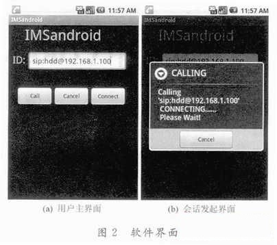 封裝后安裝到Android手機(jī)、MID或虛擬機(jī)中,并發(fā)起會(huì)話。與開源SIP軟件Linphone通信的結(jié)果如圖2所示。