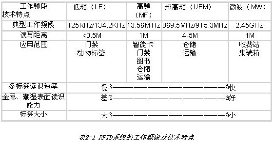 RFID系統(tǒng)的工作頻段可以為低頻(LF)(30-300kHz,典型頻率有125 kHz,134.2 kHz)、高頻(HF)(3-30MHz,典型頻率為13.56M Hz)、超高頻(UHF)(300-968MHz,典型頻率869.6MHz、915.3MHz)、微波(MW)(2.45-5.8GHz,典型頻率為2.45GHz)等四個(gè)頻段,具體的頻點(diǎn)由各個(gè)國(guó)家或地區(qū)的無(wú)線電管理部門(mén)確定。根據(jù)不同的工作頻段,在無(wú)源的情況下,其技術(shù)特點(diǎn)和應(yīng)用范圍也不同,如下表所示: