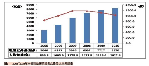 從圖1可以看到,全國移動(dòng)短信業(yè)務(wù)總量的增速逐年降低,而年人均移動(dòng)短信發(fā)送量則從最高的2007年的1180條下滑到了2010年的1027.4條。