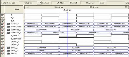使用的信號包括:數(shù)據(jù)信號data_a,dat_b;讀寫有效信號wren_a,wren_b;地址信號address_a,address_b;時鐘信號clock_a,clock_b;輸出數(shù)據(jù)信號q_a,q_b?梢钥吹剿械男盘柖际浅蓪Τ霈F(xiàn)的,就是為了進行乒乓方式的數(shù)據(jù)傳輸。分成了兩個RAM區(qū)域,A和B,相當(dāng)于前面講乒乓方式里的數(shù)據(jù)緩沖模塊1和2。兩個RAM塊是交替著讀寫(由I_a和I_b決定),輸出數(shù)據(jù)流也是由I決定。剛說到寫時鐘是13.5M,讀時鐘是27M,所以clock_a和clock_b必須是讀寫時鐘切換著輸入,而且地址的計數(shù)也不一樣,寫周期時候地址增加的時鐘是13.5M,讀周期地址增加的時鐘是27M。所以每行的數(shù)據(jù)讀了兩遍,相當(dāng)于隔行變逐行。圖6在Qartus II下RAM的乒乓操作功能仿真圖: