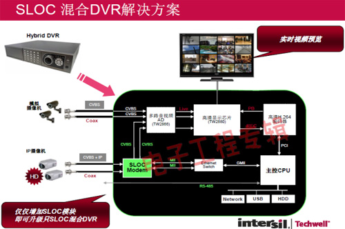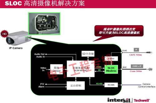 革命性的Intersil Techwell SLOCTM(Security Link over Coax)同軸電纜復(fù)合視頻傳輸解決方案是可通過一條同軸電纜同時傳輸模擬 CVBS 視頻和高清數(shù)字 IP 視頻信號的先進調(diào)制解調(diào)器解決方案,其采用最新MODEM PHY技術(shù)的傳輸解決方案,可以基于同軸電纜同時傳輸高清IP碼流和標(biāo)清模擬實時視頻。
