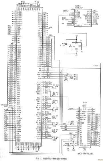 隨著電信網(wǎng)絡(luò)迅速發(fā)展,基于軟交換技術(shù)的NGN網(wǎng)絡(luò)應(yīng)運(yùn)而生。在構(gòu)建中,NGN需通過(guò)信令網(wǎng)關(guān)SG與現(xiàn)有的七號(hào)信令網(wǎng)互通,但在物理上采用HDLC格式的 E1傳輸。為了維護(hù)NGN網(wǎng)絡(luò),實(shí)現(xiàn)不同采集口的多協(xié)議關(guān)聯(lián)、呼叫的合成等功能,相應(yīng)的測(cè)試儀表必須提供網(wǎng)卡和E1卡的測(cè)試接口。根據(jù)NGN網(wǎng)絡(luò)測(cè)試儀表的總體設(shè)計(jì)方案要求,數(shù)據(jù)采集卡采用PCI插槽,E1信號(hào)經(jīng)物理接口器件成幀,通過(guò)串口送給MUSYCC,完成消息重組,最后通過(guò)PCI總線將消息送至上層軟件進(jìn)行協(xié)議分析處理。數(shù)據(jù)采集卡提供網(wǎng)絡(luò)接口的物理層、鏈路層功能以及PCI規(guī)范接口,可同時(shí)監(jiān)測(cè)8路E1信號(hào)。