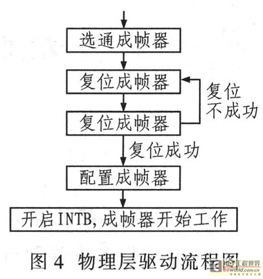 物理層通過(guò)地址總線映射配置成幀器,其中PCI橋設(shè)備和成幀器之間經(jīng)過(guò)CPLD控制選通。物理層驅(qū)動(dòng)完成配置成幀器、復(fù)位控制等。成幀器是將E1上的比特流整合成符合規(guī)范的HDLC幀,其中一個(gè)標(biāo)準(zhǔn)HDLC幀包括32個(gè)時(shí)隙,這些時(shí)隙可配置映射到HDLC控制器的端口信道,實(shí)現(xiàn)2 M、N×64 K、N×8 K高速模式。其配置流程如圖4所示。