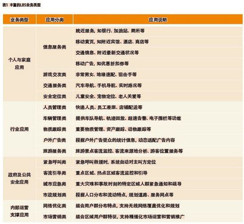 傳統(tǒng)LBS應用主要是緊急呼叫、車輛導航、物流管理、人員定位等,其實LBS作為一種基本能力,可以擴展到各類業(yè)務應用中。根據(jù)面向的服務對象的不同,LBS業(yè)務可以分為個人與家庭應用、行業(yè)應用、政府與公共安全應用和運營商內(nèi)部運營支撐應用四大類型。每種LBS業(yè)務類型都包括各類豐富應用(如表1),這里僅列舉部分應用進行簡要探討。