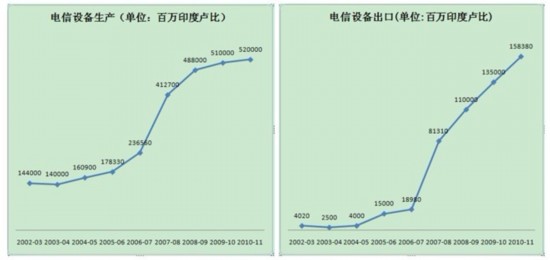 印度并不滿足于僅成為制造業(yè)中心,還計劃擴大出口。2006-2007年,印度電信設備出口總價值約為189.8億盧比,到2010-2011年,這一數(shù)字增加到1583.8億,增長了730%。