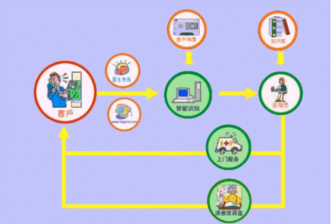 售后技術咨詢及報修:用戶購機之后,同樣可以通過電話或者網(wǎng)絡進入呼叫中心系統(tǒng),系統(tǒng)會通過用戶檔案庫得到用戶的詳細信息并為他尋找合適的咨詢員,咨詢員會依據(jù)共享的知識庫為用戶解決問題,如果用戶的機器需要上門服務。咨詢員會通過網(wǎng)絡查詢全國服務渠道的工程師和備件情況,并安排工程師迅速上門為用戶服務。維修完成一天后,系統(tǒng)會自動產生電話呼出,由咨詢員直接詢問用戶對服務過程的滿意程度,以便改進我們的工作。