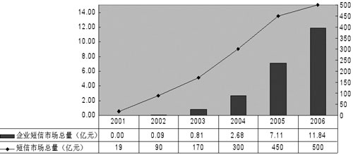 有數(shù)據(jù)顯示,2002年企業(yè)短信市場總量為0.09億元,2003年增長到0.81億元,預(yù)計2006年將突破10億元。終于,中國移動和中國聯(lián)通先后推出了面向企業(yè)用戶的“集團(tuán)短信”業(yè)務(wù),運營商對這個市場的重視使得一個新的產(chǎn)業(yè)鏈逐步完善起來,短信也開始“潤物細(xì)無聲”地改變著國內(nèi)企業(yè)的一些習(xí)慣。