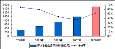 中國移動通信增值業(yè)務市場經(jīng)歷了一個曲折的發(fā)展歷程后開始日趨理性,2007年以來,移動通信增值業(yè)務的發(fā)展由爆發(fā)式增長進入平穩(wěn)快速發(fā)展階段。據(jù)統(tǒng)計,2008年上半年,中國移動增值服務市場規(guī)模達672.76億元,同比增長30%。其中短信市場規(guī)模以65.34%的比例位居第一,彩鈴和WAP分別以18.07%和8.61%的份額居其次。