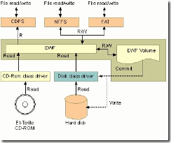 EWF能夠使操作系統(tǒng)可以從只讀媒體(如 CD ROM、寫保護(hù)硬盤或閃存)中啟動(dòng)。所有對(duì)受到 EWF保護(hù)的卷進(jìn)行的寫入都被重定向到覆蓋。這些寫入被緩存在覆蓋中并且作為卷的一部分提供。這會(huì)產(chǎn)生該卷可寫的表象。覆蓋可能存在于磁盤或隨機(jī)訪問(wèn)內(nèi)存 (RAM) 中。如果需要,可以將覆蓋中存儲(chǔ)的數(shù)據(jù)提交給受保護(hù)的卷。