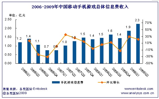 對(duì)于中國(guó)電信的手機(jī)游戲業(yè)務(wù),繼2008年手機(jī)游戲業(yè)務(wù)以16%的季度平均增長(zhǎng)率后,2009年手機(jī)游戲業(yè)務(wù)增長(zhǎng)加速,2009年第2季度市場(chǎng)規(guī)模較上季度增長(zhǎng)50%,達(dá)1.64億元。易觀國(guó)際(Analysys