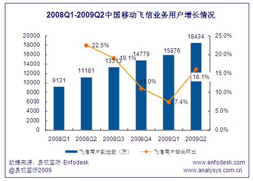 截至2009年第2季度,中國移動飛信用戶到達數(shù)達1.84億,環(huán)比增長16.1%,與2008年第2季度的1.12億用戶到達數(shù)相比同比增長64.9%,可見飛信用戶規(guī)模增長的速度十分迅速,究其原因一方面在于飛信運營商不遺余力的多渠道營銷宣傳,另一方面在于飛信用戶的口碑傳播,由于用戶規(guī)模的增長帶來更多用戶嘗試體驗飛信業(yè)務。