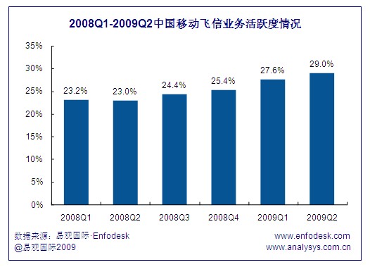 飛信用戶到達數(shù)的增長帶來了活躍用戶的穩(wěn)步提升,截止到2009年第2季度,飛信活躍用戶達到了5347萬,與2008年同期相比增長超過108.3%。由于一方面飛信到達數(shù)增長環(huán)比從2008年第2季度持續(xù)下跌,在2009年第2季度才止跌反彈,相比另一方面飛信活躍用戶的增長環(huán)比始終保持在15%以上,且從2008年第4季度開始飛信活躍用戶增幅持續(xù)擴大,因此近期飛信業(yè)務用戶活躍度表現(xiàn)出良好的增長勢頭。