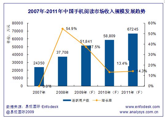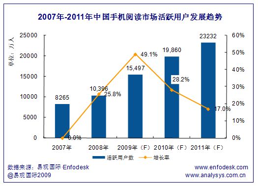易觀預(yù)測:2010年中國手機閱讀活躍用戶數(shù)將達2億