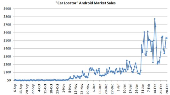 在被Android應(yīng)用商店列為特別應(yīng)用前,“汽車定位器”每天獲得的收入約為80至100美元。此后,其銷售額便大幅增加,平均每天達到435美元,情人節(jié)那天更是達到創(chuàng)紀(jì)錄的772美元。