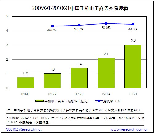 根據(jù)艾瑞咨詢即將發(fā)布的2010年第一季度中國移動互聯(lián)網(wǎng)市場數(shù)據(jù)顯示,2010Q1中國移動互聯(lián)網(wǎng)市場整體交易規(guī)模達(dá)到44.9億,環(huán)比增長5.2%。艾瑞咨詢分析認(rèn)為,盡管電信運(yùn)營商計費(fèi)政策調(diào)整,對移動增值市場收入產(chǎn)生負(fù)面影響,但是手機(jī)電子商務(wù)、手機(jī)搜索等業(yè)務(wù)領(lǐng)域的良好市場表現(xiàn),推動移動互聯(lián)網(wǎng)市場規(guī)模平穩(wěn)增長。
