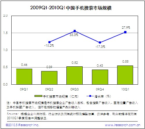 2010Q1中國手機(jī)搜索市場規(guī)模為5500萬,環(huán)比增長27.9%,手機(jī)搜索請求量和PV的大幅增長帶動廣告收入增加。自2009年下半年以來,受手機(jī)上網(wǎng)用戶規(guī)模迅速發(fā)展以及用戶活躍度和黏性顯著增加的影響,手機(jī)搜索市場進(jìn)入快速發(fā)展階段。與此同時,手機(jī)搜索企業(yè)紛紛加大市場投入力度,建立與電信運(yùn)營商和手機(jī)終端廠商的深度合作關(guān)系是業(yè)務(wù)拓展的重點(diǎn)方向。此外,網(wǎng)頁產(chǎn)品和客戶端軟件深度整合也是手機(jī)搜索企業(yè)布局移動互聯(lián)網(wǎng)市場的最佳實(shí)踐。受谷歌事件影響,艾瑞預(yù)計2010Q2手機(jī)搜索市場集中度將進(jìn)一步提高。