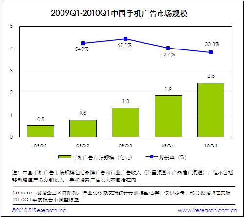 2010Q1中國手機(jī)廣告市場規(guī)模達(dá)到2.5億,環(huán)比增長30.3%.受季節(jié)性因素影響,手機(jī)廣告市場增速放緩,但是保持增長發(fā)展態(tài)勢。本季度,新聞、體育、數(shù)碼、女性和汽車類手機(jī)廣告市場表現(xiàn)良好,文本、橫幅、全屏以及客戶端軟件等手機(jī)廣告形式受到廣告主青睞。針對不同受眾群體進(jìn)行多重定向廣告營銷成為更多手機(jī)廣告服務(wù)提供商的實(shí)踐方向。盡管本季度手機(jī)廣告市場取得良好的市場表現(xiàn)力,但是廣告定價和廣告效果評估等制約手機(jī)廣告市場發(fā)展的關(guān)鍵因素仍將長期存在。