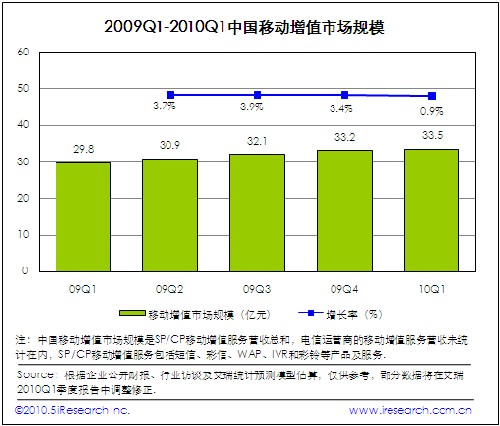 電信運(yùn)營商計費(fèi)政策重大調(diào)整對整個移動增值市場產(chǎn)生巨大影響力,2010Q1移動增值市場規(guī)模為33.5億,與09Q1基本持平。電信運(yùn)營商實(shí)施計費(fèi)通道的強(qiáng)力治理措施,對產(chǎn)品線以WAP計費(fèi)為主的企業(yè)造成嚴(yán)重生存壓力,與此同時采用短信計費(fèi)的移動增值產(chǎn)品營銷也受到不同程度影響。實(shí)現(xiàn)由單一移動增值業(yè)務(wù)向移動互聯(lián)網(wǎng)服務(wù)進(jìn)行戰(zhàn)略轉(zhuǎn)型,是SP企業(yè)戰(zhàn)略發(fā)展的實(shí)踐路徑。艾瑞認(rèn)為電信運(yùn)營商實(shí)施全新的合作伙伴計費(fèi)政策,將重新構(gòu)建移動增值市場秩序。