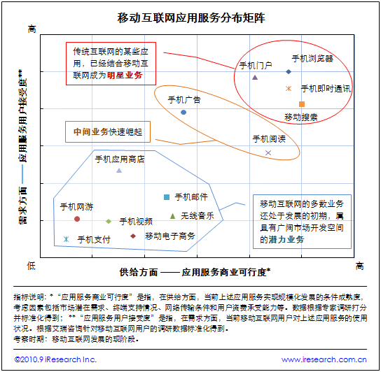 根據(jù)艾瑞咨詢(xún)近期發(fā)布的《2009-2010年中國(guó)移動(dòng)互聯(lián)網(wǎng)行業(yè)發(fā)展報(bào)告》,移動(dòng)互聯(lián)網(wǎng)各應(yīng)用服務(wù)在“應(yīng)用服務(wù)商業(yè)可行度”和“應(yīng)用服務(wù)用戶(hù)接受度”兩個(gè)維度上被劃分為“明星業(yè)務(wù)”、“中間業(yè)務(wù)”和“潛力業(yè)務(wù)”三個(gè)類(lèi)型。具備一定規(guī);l(fā)展市場(chǎng)條件,但還面臨若干限制因素的移動(dòng)互聯(lián)網(wǎng)業(yè)務(wù),將在未來(lái)逐步打開(kāi)市場(chǎng)。