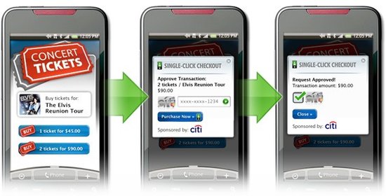 北京時(shí)間11月10日消息,據(jù)國外媒體報(bào)道,花旗銀行支持的Single-Click Checkout(singleclickcheckout.com)服務(wù)今天在舊金山的開放移動(dòng)峰會(huì)(Open Mobile Summit)上推出,它是第一個(gè)為Android設(shè)計(jì)的信用卡結(jié)帳應(yīng)用程序。使用這項(xiàng)新服務(wù),商家可以接受來自任何移動(dòng)用戶的信用卡付款。