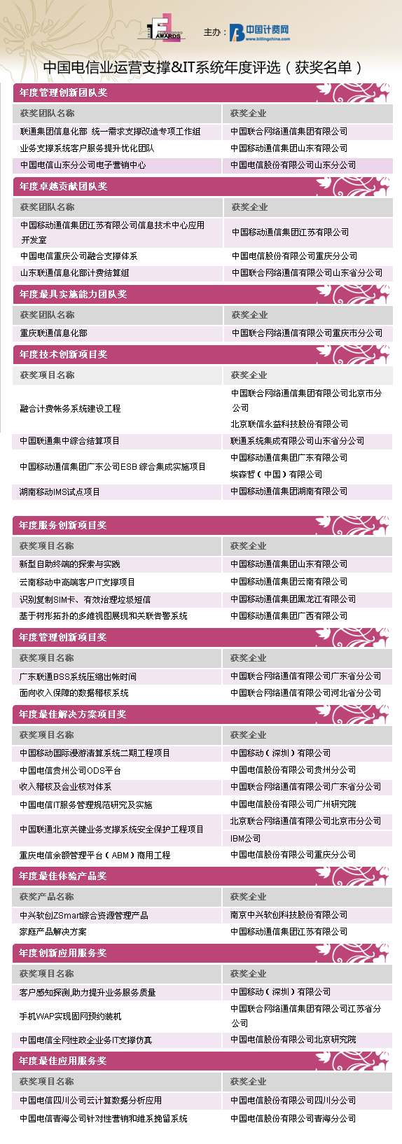 由中國計費網(wǎng)(www.billingchina.com)主辦的“Awards2010”第四屆中國電信業(yè)運營支撐&IT系統(tǒng)年度評選活動的結(jié)果于2011年元月31日隆重揭曉。自2010年12月1日評選活動正式啟動以來,歷時兩個月,來自國內(nèi)運營商集團(tuán)、省級公司、IT產(chǎn)品與服務(wù)提供商的42家企業(yè)的優(yōu)秀產(chǎn)品、項目和團(tuán)隊共計70份參評項目入圍評選。經(jīng)過全面征集、選拔、初審以及評委團(tuán)的嚴(yán)格評審,評選結(jié)果已經(jīng)公示。在30位來自運營商IT支撐、業(yè)務(wù)和服務(wù)部門的威權(quán)評委們的認(rèn)真評審后,共有27家企業(yè)分別獲得了30個Awards2010的團(tuán)隊/項目/產(chǎn)品/應(yīng)用服務(wù)的榮譽桂冠。