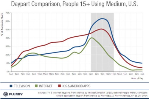 移動分析公司Flurry的一項(xiàng)最新研究表明,和電視節(jié)目有黃金收視時(shí)段一樣,移動應(yīng)用也有黃金使用時(shí)段,晚上7點(diǎn)左右是用戶使用移動應(yīng)用的頂峰期。