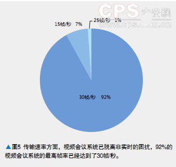 從最大圖像分辨率來看,有39%以上的視頻會議系統(tǒng)采用1024×768分辨率,另外有24%的視頻會議系統(tǒng)采用1280×1024分辨率,而704×576分辨率的視頻會議系統(tǒng)占比為19%。更低分辨率的視頻會議系統(tǒng)的占比不到20%。這說明向高清分辨率發(fā)展是視頻會議系統(tǒng)的主流。