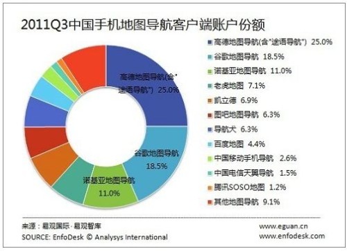 谷歌:以18.5%的綜合份額占據(jù)中國(guó)手機(jī)地圖導(dǎo)航客戶端市場(chǎng)排名次席。其中,谷歌地圖仍舊以27%的份額占據(jù)手機(jī)地圖客戶端市場(chǎng)第一的位置,但因?yàn)槠浣?jīng)營(yíng)策略和中國(guó)國(guó)內(nèi)政策等原因,谷歌地圖在內(nèi)地行貨版安卓手機(jī)中普遍被閹割,在一定程度上影響了谷歌地圖市場(chǎng)占有率的進(jìn)? 徊教嶸。链撯,业娇N氈樵げ餛還雜惺只贗疾方魑筆旨隊(duì)τ迷趇Phone5中推出,這有可能撼動(dòng)谷歌地圖在IOS平臺(tái)的統(tǒng)治地位。