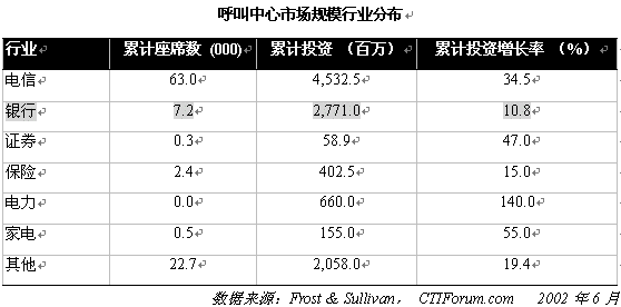 。。中國呼叫中心市場規(guī)模難于確定。根據(jù)CTIForum 的統(tǒng)計(jì)數(shù)字,截止到2001年,中國呼叫中心座席總數(shù)達(dá)到96,200個,市場規(guī)模達(dá)到106.38億元,分別較去年同期增長51.6%,55.2%。2001年,中國呼叫中心市場規(guī)模在各行業(yè)中的分布如下表所示: