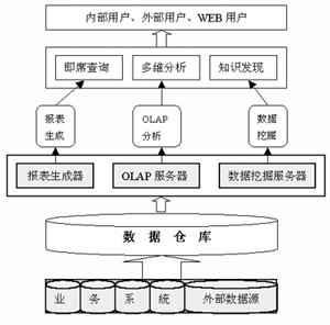 數(shù)據(jù)倉庫系統(tǒng)一般包括三層結(jié)構(gòu):數(shù)據(jù)獲取層、數(shù)據(jù)存儲(chǔ)層、數(shù)據(jù)輸出層。數(shù)據(jù)獲取層通常采用弱耦合方式與業(yè)務(wù)系統(tǒng)數(shù)據(jù)庫相連,通過對(duì)業(yè)務(wù)系統(tǒng)數(shù)據(jù)進(jìn)行抽取、轉(zhuǎn)換和加載后,導(dǎo)入數(shù)據(jù)倉庫;數(shù)據(jù)存儲(chǔ)層完成對(duì)數(shù)據(jù)倉庫系統(tǒng)中數(shù)據(jù)的存儲(chǔ)和管理,為了便于對(duì)海量數(shù)據(jù)的管理,總是把數(shù)據(jù)以一定的規(guī)則組織起來,如何從邏輯和物理上去組織數(shù)據(jù),是數(shù)據(jù)倉庫建設(shè)的重要步驟;數(shù)據(jù)的輸出層與OLAP服務(wù)器、數(shù)據(jù)挖掘服務(wù)器相連,對(duì)數(shù)據(jù)倉庫中的數(shù)據(jù)進(jìn)行多維分析和挖掘。