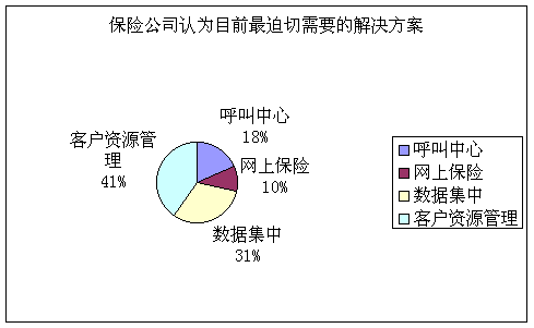 研究發(fā)現(xiàn),保險公司目前最急需的解決方案是客戶資源管理和數(shù)據(jù)集中。有40.2%的保險公司認為CRM最為迫切或有發(fā)展前景,所占比例最高;其次是數(shù)據(jù)集中,所占比例為31.2%;認為呼叫中心最為迫切或有發(fā)展前景的保險公司比例是18.4%,而對于網(wǎng)上保險,這個比率只有10.2%。