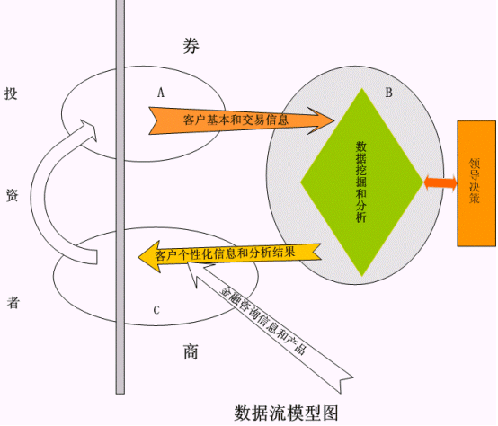 如數(shù)據(jù)流和服務(wù)模型圖所示,B模塊就是對客戶進行數(shù)據(jù)分析和數(shù)據(jù)挖掘的模塊。這個模塊將會對領(lǐng)導決定支持和為下一步真正的為核心客戶提供更有針對行的服務(wù)提供基礎(chǔ)。