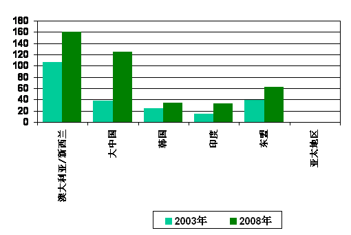亞太區(qū)(日本除外)的CRM應(yīng)用市場(chǎng)中,澳大利亞繼續(xù)處于主導(dǎo)地位,2003年市場(chǎng)規(guī)模為9,740萬(wàn)美元,據(jù)IDC預(yù)測(cè),2008年有望增至1.452億美元,未來(lái)五年的年復(fù)合增長(zhǎng)率將達(dá)到8%。中國(guó)以2,580萬(wàn)美元的CRM應(yīng)用市場(chǎng)收入居其次,且IDC預(yù)測(cè),2008年的市場(chǎng)收入將達(dá)1.086億美元,未來(lái)五年的年復(fù)合增長(zhǎng)率為33%。此外,中國(guó)金融、電信等服務(wù)行業(yè)的市場(chǎng)化,迫使這些行業(yè)為了保持競(jìng)爭(zhēng)能力而增強(qiáng)CRM技術(shù)的應(yīng)用,這是CRM應(yīng)用在金融和電信行業(yè)的普及、從而帶動(dòng)中國(guó)CRM應(yīng)用市場(chǎng)迅猛增長(zhǎng)的原因。另外,進(jìn)駐中國(guó)的外資企業(yè)在CRM方面的投入也帶動(dòng)了需求的增長(zhǎng)。亞太區(qū)(日本除外)第三大CRM應(yīng)用市場(chǎng)是韓國(guó),2003年市場(chǎng)收入約為2,500萬(wàn)美元,2008年有望增至3,390萬(wàn)美元,未來(lái)五年的年復(fù)合增長(zhǎng)率6%。