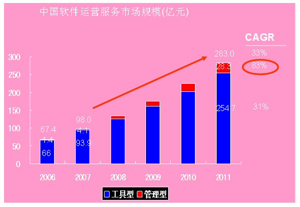 值得注意的是,在2006年,軟件運(yùn)營服務(wù)產(chǎn)業(yè)的主要貢獻(xiàn)來自于工具型軟件運(yùn)營服務(wù),管理型軟件運(yùn)營服務(wù)產(chǎn)業(yè)規(guī)模只有1.38億元,僅占2%。但管理型軟件運(yùn)營服務(wù)產(chǎn)業(yè)增長非常迅速,未來五年的復(fù)合增長高達(dá)83%,2011年的產(chǎn)業(yè)規(guī)模將達(dá)到28億元,市場發(fā)展?jié)摿薮蟆?br />