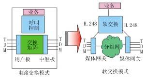 在電路交換網(wǎng)中,呼叫控制、業(yè)務(wù)提供以及交換矩陣均集中在一個交換系統(tǒng)中,而軟交換的主要設(shè)計思想是業(yè)務(wù)/控制與傳送/接入分離,各實(shí)體之間通過標(biāo)準(zhǔn)的協(xié)議進(jìn)行連接和通信,以便在網(wǎng)上更加靈活地提供業(yè)務(wù),見圖1。更具體地講,軟交換是一個基于軟件的分布式交換/控制平臺,它將呼叫控制功能從網(wǎng)關(guān)中分離出來,開放業(yè)務(wù)、控制、接入和交換間的協(xié)議,從而真正實(shí)現(xiàn)多廠家的網(wǎng)絡(luò)運(yùn)營環(huán)境,并可以方便地在網(wǎng)上引入多種業(yè)務(wù)。