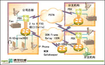 利用清華比威BitEngine系列路由器產(chǎn)品提供的VoIP(Voice over IP)支持,以及該產(chǎn)品具有的安全、加密、QoS、路由等特性,通過將長話旁路到數(shù)據(jù)網(wǎng)上,為企業(yè)節(jié)省大量的長話費用開銷,同時利用豐富的接口,同原有的交換機相連,有效保護了企業(yè)原先的投資繼續(xù)有效。本方案中,使用清華比威的BitEngine2650/3600路由器實現(xiàn)企業(yè)間數(shù)據(jù)業(yè)務和語音業(yè)務的融合,BitEngine系列路由器提供了完善的QoS保證機制(支持PQ/WFQ/CBWFQ/WRED等多種隊列方式),確保語音數(shù)據(jù)的優(yōu)先處理。