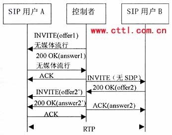 本流程中,控制者向A發(fā)送一個沒有SDP的INVITE。A應(yīng)答的200 OK響應(yīng)中包含一個offerl,控制者立即在ACK消息中產(chǎn)生一個“黑洞”SDP應(yīng)答。