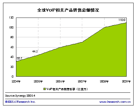 艾瑞市場咨詢(iResearch)根據(jù)Synergy的數(shù)據(jù)整理顯示,隨著VoIP市場的開發(fā),企業(yè)用戶對VoIP的接受度增加,在2004年VoIP相關(guān)產(chǎn)品的銷售總額達(dá)到了30.7億美元,預(yù)計在2005年可達(dá)到44.2億美元,2009年將突破110億美元。