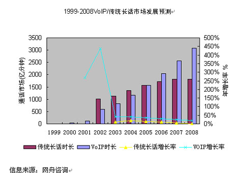 2000年以來,IP長(zhǎng)話憑借明顯的資費(fèi)優(yōu)勢(shì),對(duì)傳統(tǒng)長(zhǎng)話形成了有力的競(jìng)爭(zhēng),在通話量上已趕超了傳統(tǒng)長(zhǎng)話。也正是由于IP長(zhǎng)話的低資費(fèi),在其通話量大幅度增加的同時(shí),也導(dǎo)致了國內(nèi)長(zhǎng)話網(wǎng)總體收入的下降,長(zhǎng)途電話IP化的趨勢(shì)十分明顯?傮w而言,中國VoIP市場(chǎng)仍蘊(yùn)藏著非常大的潛力,按照3G和NGN的部署速度, 2008年大部分本地長(zhǎng)話和幾乎全部國際長(zhǎng)話業(yè)務(wù)中VoIP將占據(jù)統(tǒng)治地位,傳統(tǒng)電路交換方式長(zhǎng)話電話的份額將進(jìn)一步萎縮到10%以下。