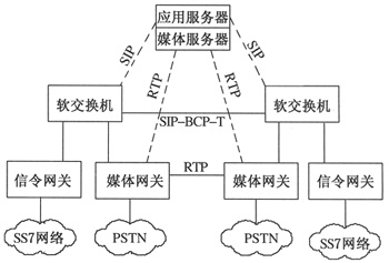 在VoIP業(yè)務的網(wǎng)絡環(huán)境中,主要有軟交換機(Softswitch)、媒體網(wǎng)關(MG)、信令網(wǎng)關(SG)和應用服務器(ApplicationServer)4個基本控件。其業(yè)務環(huán)境如圖2所示。
