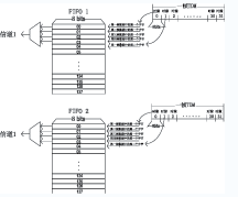FIFO中的四幀數(shù)據(jù)被讀空時(shí)間大于第五幀的第一個(gè)字節(jié)寫(xiě)入FIFO的準(zhǔn)備時(shí)間,F(xiàn)IFO的寫(xiě)滿與讀空都是有硬件產(chǎn)生信號(hào)標(biāo)識(shí),此時(shí)FIFO讀空信號(hào)標(biāo)識(shí)未產(chǎn)生,不能對(duì)同一FIFO進(jìn)行寫(xiě)操作,導(dǎo)致待寫(xiě)數(shù)據(jù)丟失。因此選用兩個(gè)FIFO采用乒乓機(jī)制來(lái)切換讀寫(xiě)操作,如圖4所示!