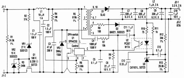 整個電源效率為78%,這樣1個簡單的反激電源能提供3.3V(2A)。對大多數(shù)應用來講,低成本和簡單化是最重要的特性。假若采用同步整流正激轉(zhuǎn)換器拓撲和具有較低通導功耗、較高功率的器件DPA424G,則電路效率可增加5%~10%。