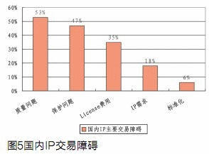根據(jù)我們對92家芯片設(shè)計企業(yè)的問卷調(diào)查,IP質(zhì)量、IP保護(hù)和IP費用是目前國內(nèi)IP核交易中的主要障礙。(見圖5)