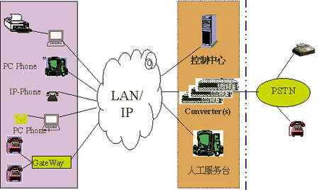 如圖點(diǎn)劃線(xiàn)左邊所示,IP PBX系統(tǒng)通過(guò)在網(wǎng)絡(luò)中加入控制中心并利用原有網(wǎng)絡(luò)的結(jié)點(diǎn)(多媒體配置),將LAN改造為PBX電話(huà)網(wǎng)絡(luò)。IP