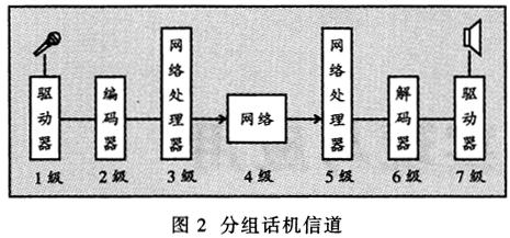 ——無論對于實時的應(yīng)用(如IP電話)還是非實時的應(yīng)用(如語音郵件),發(fā)送端語音都要經(jīng)過模擬信號—數(shù)字信號—語音包的處理過程,并在接收端對語音包進(jìn)行相反的處理,從而得到與輸入端相同的語音信號。由圖2可見,每個語音流從信源(話筒)到信宿(揚聲器)就像通過一條管道,這條管道包括許多級,每一級代表一些特有的語音包處理過程。